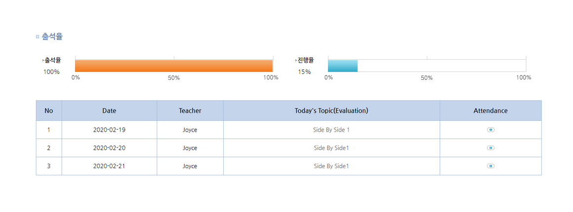 출석표에서는 강의평가서, 강사정보, 출/결석에 대한 데이터, 출석률, 수업진행률을 확인하실 수 있습니다.